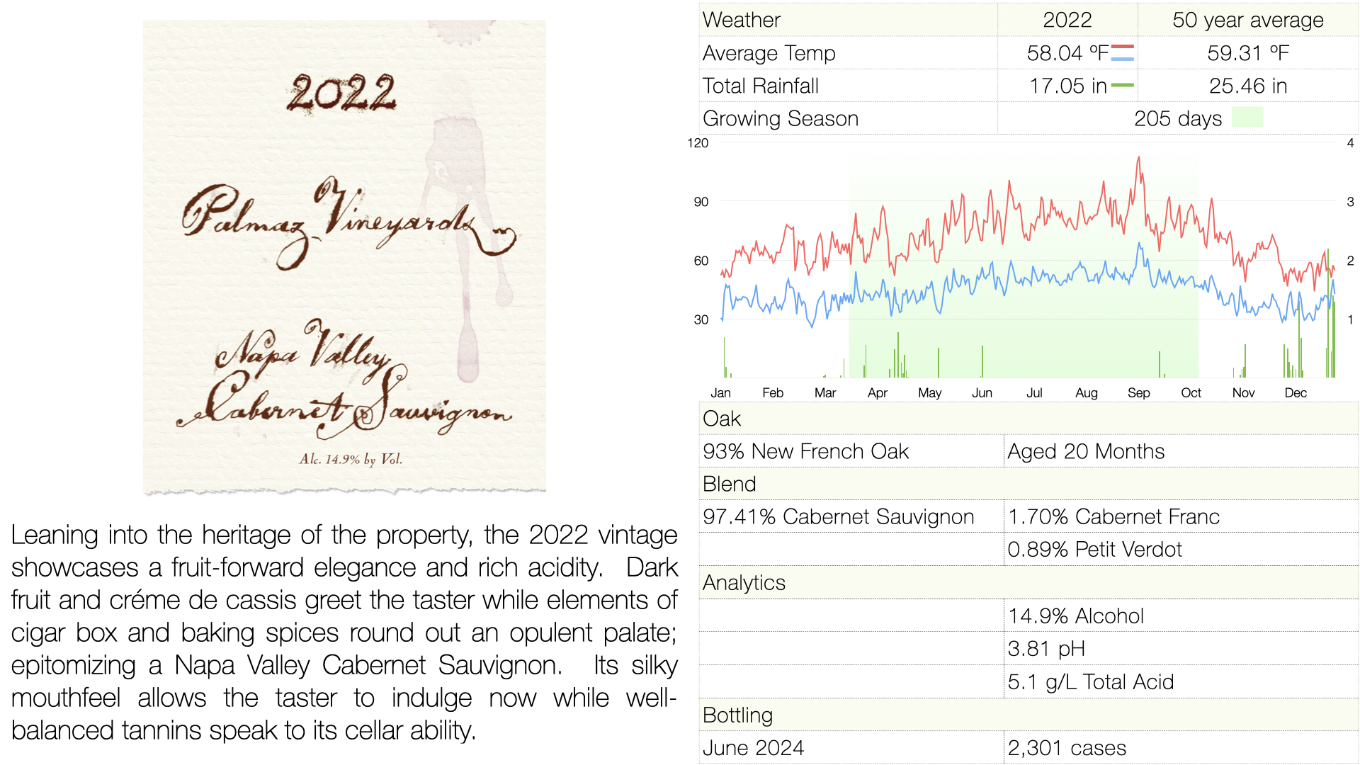 OAK:93% New French Oak BLEND:97.41% Cabernet Sauvignon ANALYTICS:14.9% Alcohol BOTTLING:June 2024 |