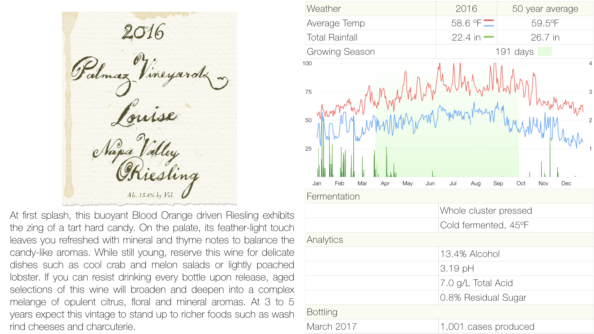 FERMENTATION:Whole cluster pressed ANALYTICS:13.4% Alcohol BOTTLING:March 2017 |