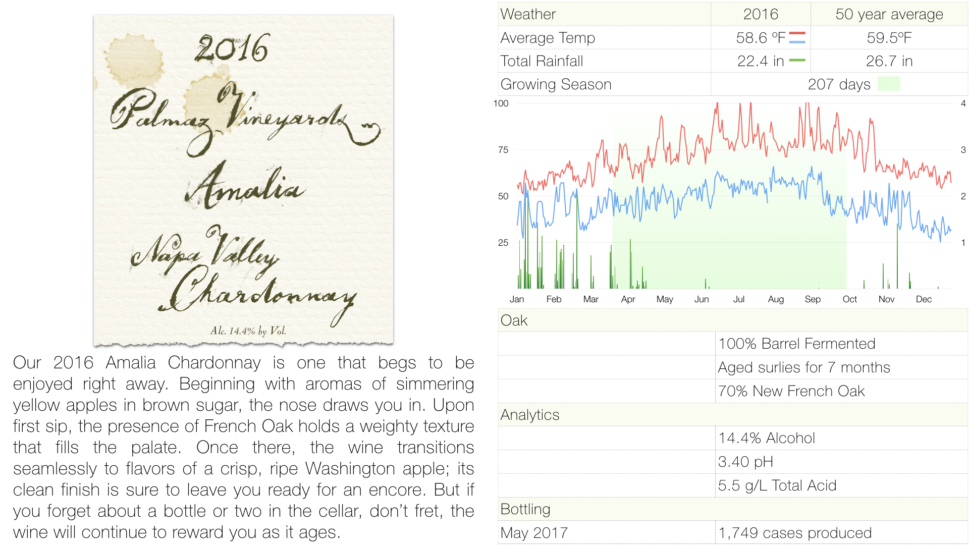 OAK:100% barrel fermented ANALYTICS:14.4% Alcohol BOTTLING:May 2017 |